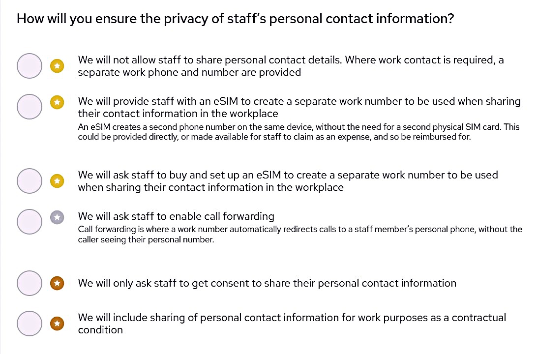 When answering questions about your approach, you will be prompted to choose from a list of options. These options are rated Gold, Silver or Bronze, depending on how securely they protect data. This will help you to understand how well you are managing the issue at present, and how you can strengthen your approach in future.